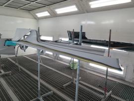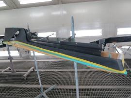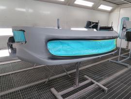 パーツの表面のデコボコをダブルアクションサンダーで削り落とし、小さなキズやFRP特有の巣穴と呼ばれる気泡のようなものをパテ等を使って丹念に1つ残らずなくす作業を行います。その後、サフェーサーを塗装し、さらに小さな巣穴を見逃さないためにきっちりガイドコートで確認しながら水磨ぎします。 |