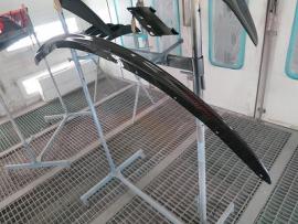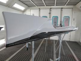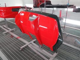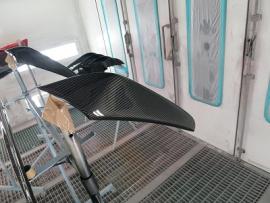 このようにサフェーサー塗装→水磨ぎ→クリアー塗装→水磨ぎ→マットブラック塗装→マスキング→赤塗装→マスキングを剥がし→クリアー塗装と何度も細かく工程をわけて作業いたします。ツートン塗装やとカーボン残し等の塗装はとても手間がかかります。 |