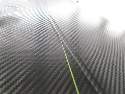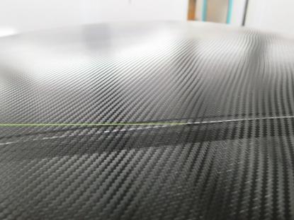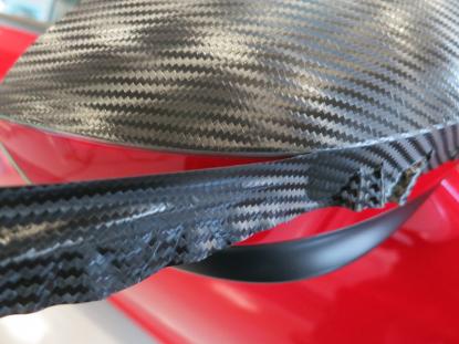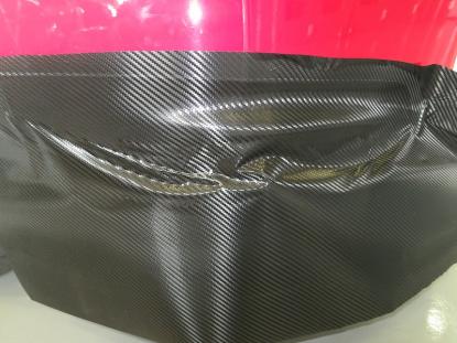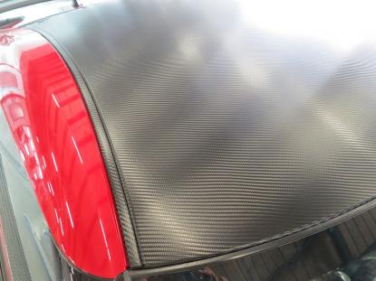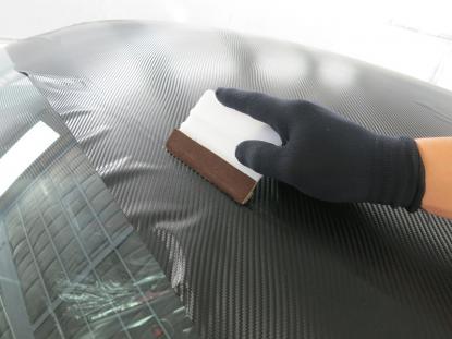 貼り付けたカーボン調フィルムをフェルト付きのヘラで空気を抜いて行きます。 |