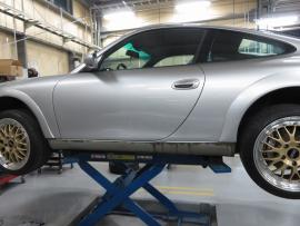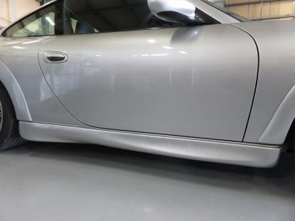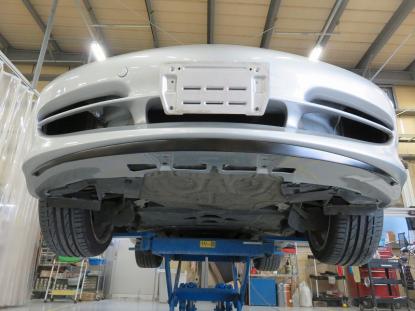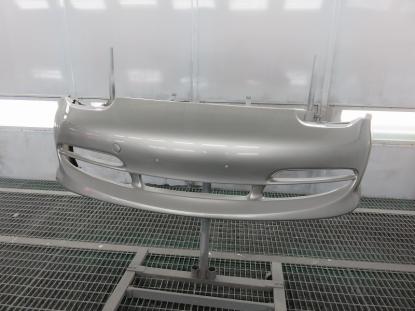 サイマ社のイタリア製高級塗装ブースの中でポルシェ911(996型)のマスキングが終わり、シリコンオフで脱脂をしたら塗装前の準備が完了です。 |